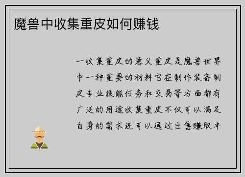 一、收集重皮的意义 重皮是魔兽世界中一种重要的材料,它在制作装备、制皮专业技能、任务和交易等方面都有广泛的用途。收集重皮不仅可以满足自身的需求,还可以通过出售赚取丰厚的金币。 二、选择合适的地点 在魔...