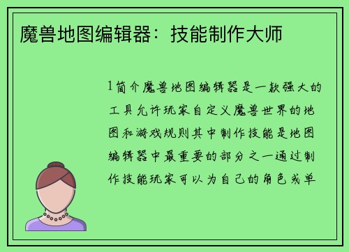 1. 简介 魔兽地图编辑器是一款强大的工具,允许玩家自定义魔兽世界的地图和游戏规则。其中,制作技能是地图编辑器中最重要的部分之一。通过制作技能,玩家可以为自己的角色或单位添加新的能力和特殊效果,丰富游...