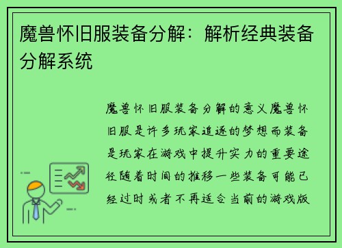 魔兽怀旧服装备分解的意义 魔兽怀旧服是许多玩家追逐的梦想,而装备是玩家在游戏中提升实力的重要途径。随着时间的推移,一些装备可能已经过时或者不再适合当前的游戏版本。在这种情况下,玩家可以选择将这些装备分...