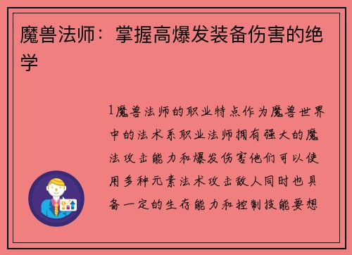 1. 魔兽法师的职业特点 作为魔兽世界中的法术系职业,法师拥有强大的魔法攻击能力和爆发伤害。他们可以使用多种元素法术攻击敌人,同时也具备一定的生存能力和控制技能。要想打出高爆发装备伤害,魔兽法师需要注...